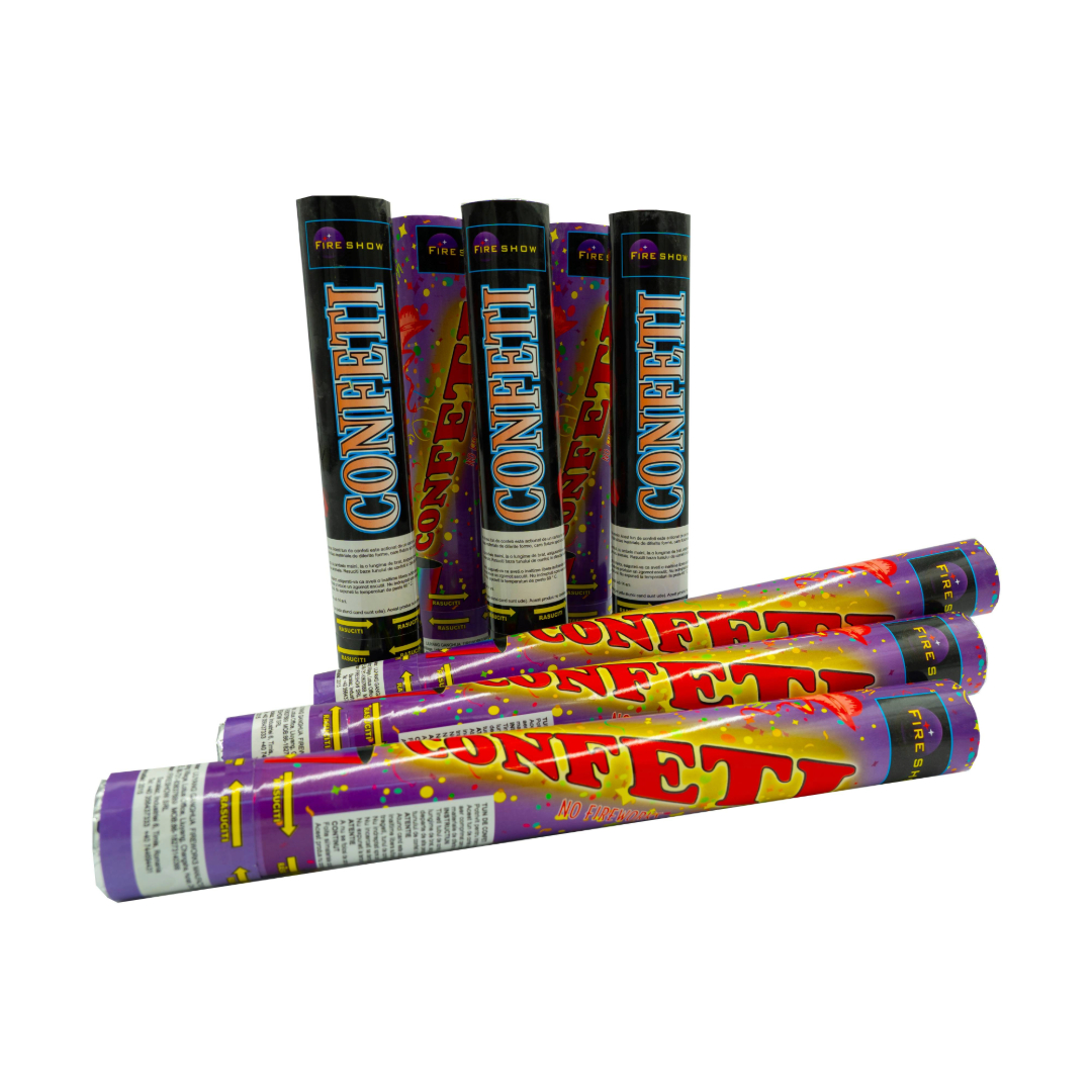 Acest tun de confeti este acționat de un cartuș cu aer comprimat care proiectează în aer foițe și materiale de diferite forme, care flutură apoi ușor spre sol.